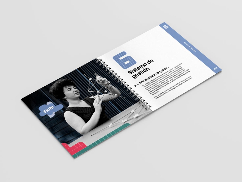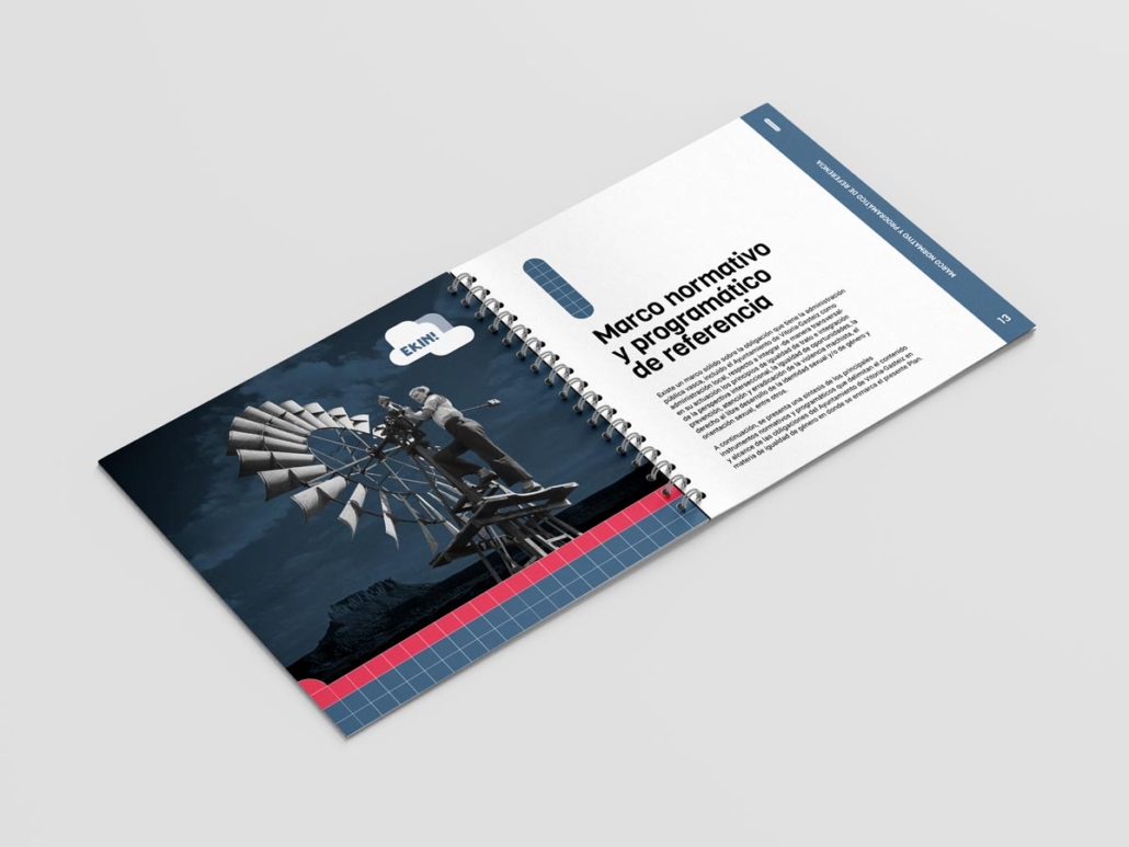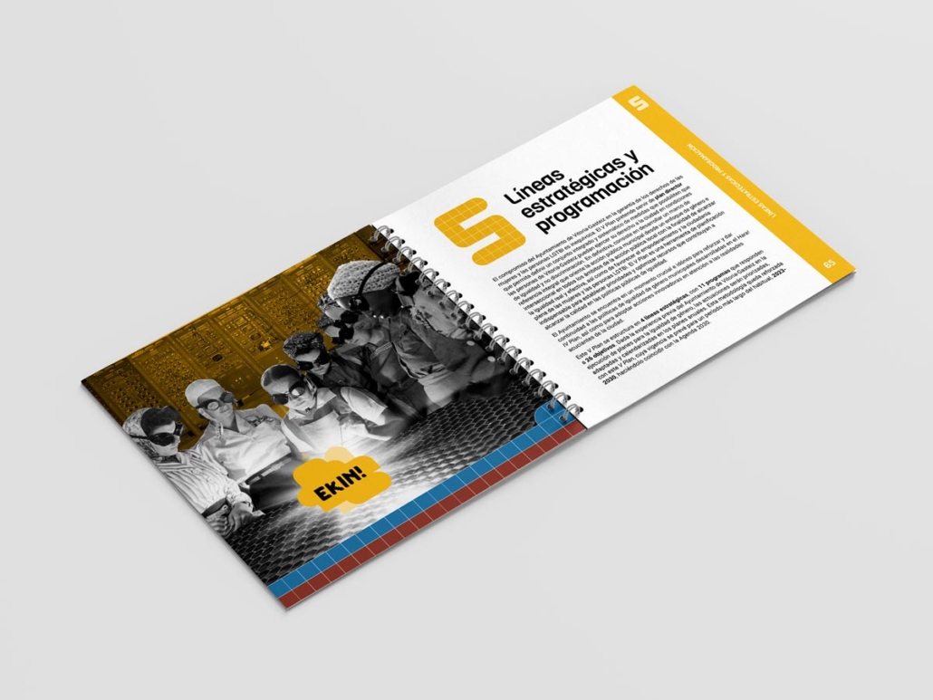 Para la identidad del V Plan, desarrollamos un logotipo a partir del lema “EKIN!”, construido de manera modular al igual que el indicativo del periodo 2023-2030. Para el diseño de las publicaciones que recogen el plan, creamos diferentes imágenes por medio del collage con fotografías antiguas.